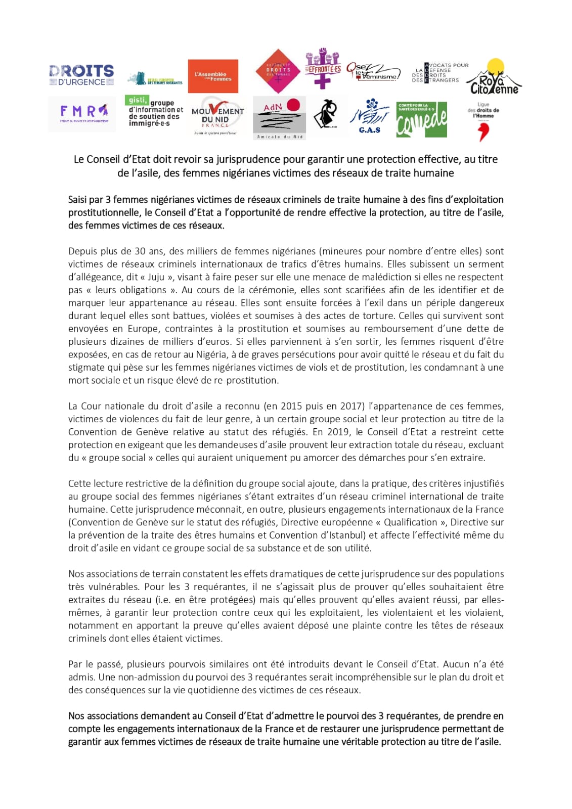 Nos associations demandent au Conseil d’Etat d’admettre le pourvoi des 3 requérantes, de prendre en compte les engagements internationaux de la France et de restaurer une jurisprudence permettant de garantir aux femmes victimes de réseaux de traite humaine une véritable protection au titre de l’asile.