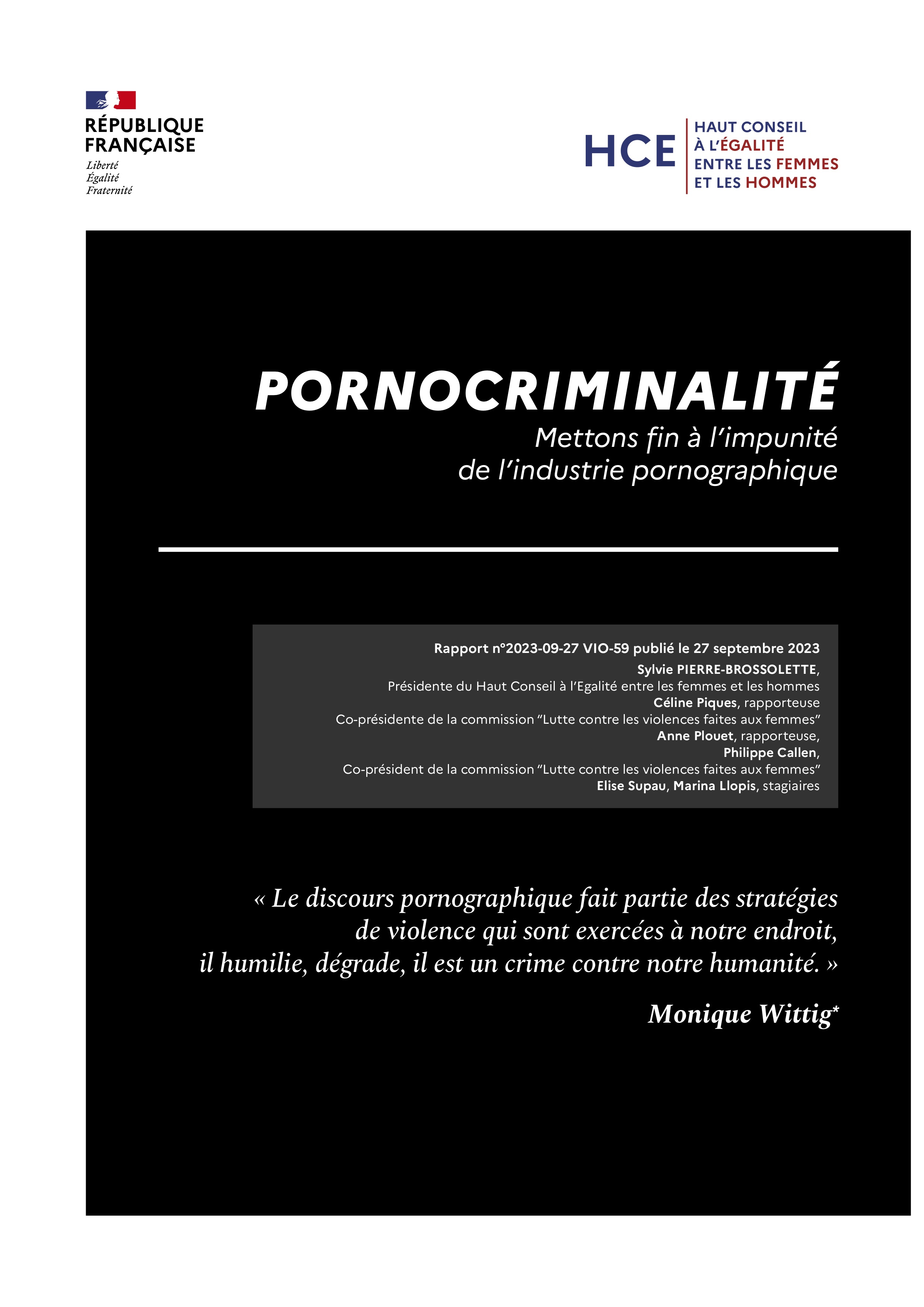 Osez le féminisme ! dénonce depuis plusieurs années le système pornocriminel, qui prospère sur la haine et la violence misogyne, dans l’indifférence générale et l’illégalité la plus totale. 90% des contenus pornographiques présentent des actes non simulés de violences physiques, sexuelles ou verbales contre les femmes. La pornographie n’est pas du cinéma. Ce rapport du Haut Conseil à l’Egalité, à l’expertise indéniable, confirme par ses analyses l’importance du combat précurseur mené par notre association contre le système pornocriminel.