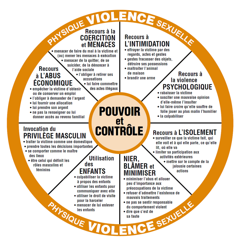 Elle a peur et ne va pas sortir et dépenser de l’argent ◆ J’obtiens ce que tu veux : je sors librement ◆ Elle me respecte ◆ Elle cesse de discuter ◆ Sentiment de supériorité : elle doit me rendre des comptes pour ce qui est d’être quelque part à l’heure : c’est moi qui décide ◆ Cela maintient la relation – elle a trop peur de partir ◆ Obtenir l’argent ◆ Obtenir du sexe ◆ Contrôle total dans la prise de décision ◆ Obtenir de l’argent pour de la drogue ◆ Ne pas avoir à changer pour elle ◆ Conserver le pouvoir ◆ Décider où on va (ensemble) ◆ Décider qui voir ◆ Décider quoi porter ◆ Contrôler les enfants ◆ Si elle est en retard, elle ne le sera jamais plus ◆ Intimidation ◆ Lui faire peur pour l’empêcher de me tenir tête ◆ La convaincre qu’elle se goure ◆ L’amener à se sentir moins valable et à s’en remettre à mes besoins et à mes désirs ◆ L’amener à me respecter et à accepter mes décisions sans discuter ◆ Me permettre de décider de sa vie sociale – de ce qu’elle porte pour que son allure n’affecte pas mon image sociale ◆ Faire en sorte qu’elle ne trouve pas de soutien contre moi pour les violences précédentes, parce qu’elle n’a personne pour la soutenir et qu’elle est troublée par mes mensonges ◆ La convaincre qu’elle est cinglée ◆ La convaincre qu’elle est laide ◆ La convaincre que le problème tient à elle ◆ Pouvoir me défouler sur elle ◆ Me servir des enfants pour « espionner » maman ◆ Empêcher les enfants de dire à maman ce que j’ai fait ◆ Empêcher que les enfants ne me critiquent ◆ M’éviter d’avoir à lui parler ◆ Cela fait de moi le maître de la maison ◆ Je peux me défiler quand je veux ◆ J’ai quelqu’un sur qui me vider le coeur ◆ J’ai quelqu’un contre qui râler ◆ Faire en sorte qu’elle n’appelle pas la police ◆ Pouvoir dire aux enfants qu’ils n’ont pas à écouter maman ◆ Faire en sorte qu’elle interrompe toute poursuite ◆ Faire en sorte qu’elle me soutienne auprès de sa famille, ma famille, les flics, le juge, le Programme d’intervention de crise, les procureurs, etc. ◆ Lui faire admettre que tout est de sa faute ◆ Arriver à la blâmer pour mes raclées ◆ Elle est un objet ◆ Cela me fournit un robot baby-sitter, une femme de ménage, du sexe, de la nourriture et flatte mon ego ◆ Cela me permet de me vanter ◆ Si elle travaille – j’obtiens son argent. ◆ La faire quitter son emploi pour qu’elle s’occupe mieux de la maison ◆ L’isoler pour que ses ami.es ne puissent pas me tenir tête ◆ Décider comment l’argent est dépensé ◆ « Passer pour le soutien de famille » ◆ Acheter les jouets que je veux ◆ Prendre du temps pour moi ◆ Elle doit compter sur moi si je casse ses affaires ◆ Je suis au courant de tout ◆ Elle me sert d’infirmière-femme de ménage ◆ Elle me réconforte ◆ Le dîner est toujours sur la table ◆ Pouvoir inviter des amis à l’improviste = plus de travail pour elle ◆ Pas de compromis = plus de liberté ◆ Ne pas avoir à l’écouter se plaindre de ne pas être informée à l’avance ◆ Elle travaille pour moi ◆ Je n’ai pas à l’aider ◆ Je n’ai pas à traîner avec elle ou les enfants ◆ Déterminer les valeurs des enfants – avec qui ils jouent, quelle école ils fréquentent ou arriver à ignorer tout ce processus – dicter ce dont ils « ont besoin » : nourriture, vêtements, loisirs, etc. ◆ Dicter la réalité ◆ Les enfants sont de mon côté contre elle ◆ Les enfants font ce que je dis ◆ Amener les enfants à m’aider en s’acquittant de mes tâches ◆ Faire taire les enfants au sujet de ma violence ◆ M’éviter d’avoir à me lever, à sortir les poubelles, à surveiller les enfants, à faire la vaisselle, à me lever la nuit m’occuper des enfants, à faire la lessive, à changer les couches, à nettoyer la maison, à amener les enfants à leurs rendez-vous ou autres activités, à passer la serpillière, à nettoyer le réfrigérateur, etc. ◆ Ne répondre à personne de mes comportements ◆ Faire ce que je veux, quand je le veux ◆ Pouvoir ignorer/nier mes antécédents de violence et autres comportements irresponsables ◆ Réécrire l’histoire ◆ Déterminer l’avenir ◆ Choisir mes batailles et ce qu’il lui en coûtera ◆ Prouver ma supériorité ◆ Gagner toutes les discussions ◆ Ne pas avoir à écouter ses souhaits, ses plaintes, sa colère, ses craintes, etc. ◆ Faire les règles puis les enfreindre quand je le souhaite