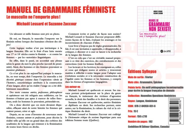 Alors que l’Etat par la voix de son premier ministre souhaite « clore la polémique » sur l’écriture inclusive, en la balayant, je signale la publication prochaine de cet ouvrage de Mickaël Lessard & Suzanne Zaccour : Manuel de grammaire non sexiste – le masculin ne l’emporte plus ! Je relaye ensuite par la même occasion 2 textes à ce sujet.
